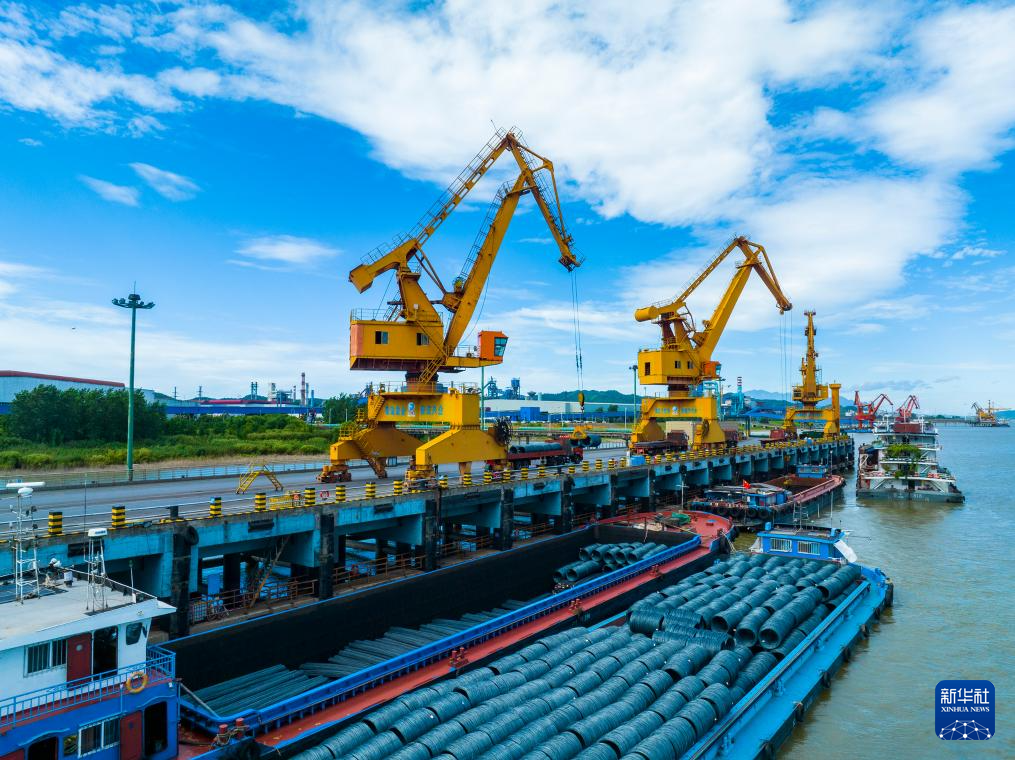 正在方大集团萍钢钢铁无限公司位于长江边的船埠,塔吊正在拆卸货色(2025年7月20日摄)。发(张玉摄)。